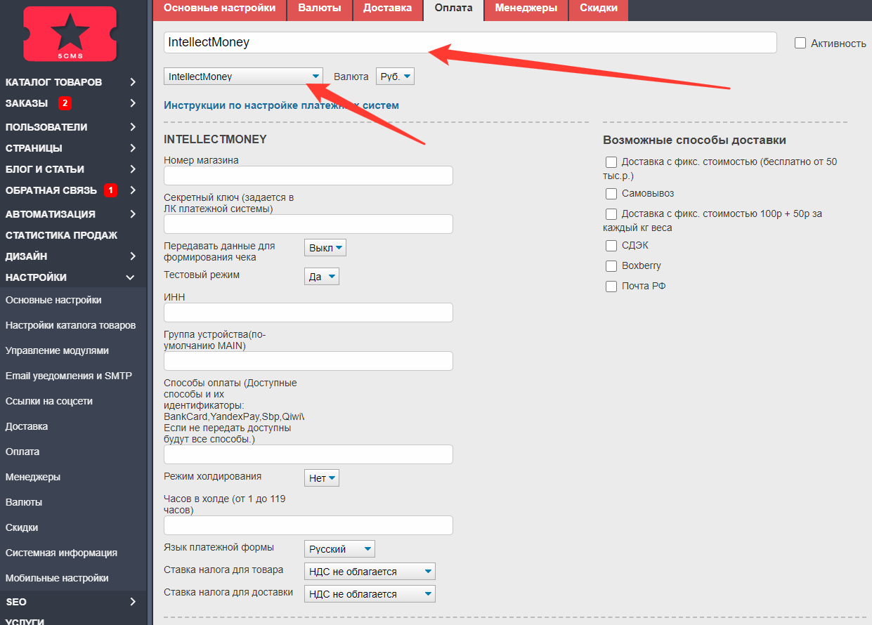 В административной панели сайта, выбрать пункт "Оплата" в разделе "Настройки";