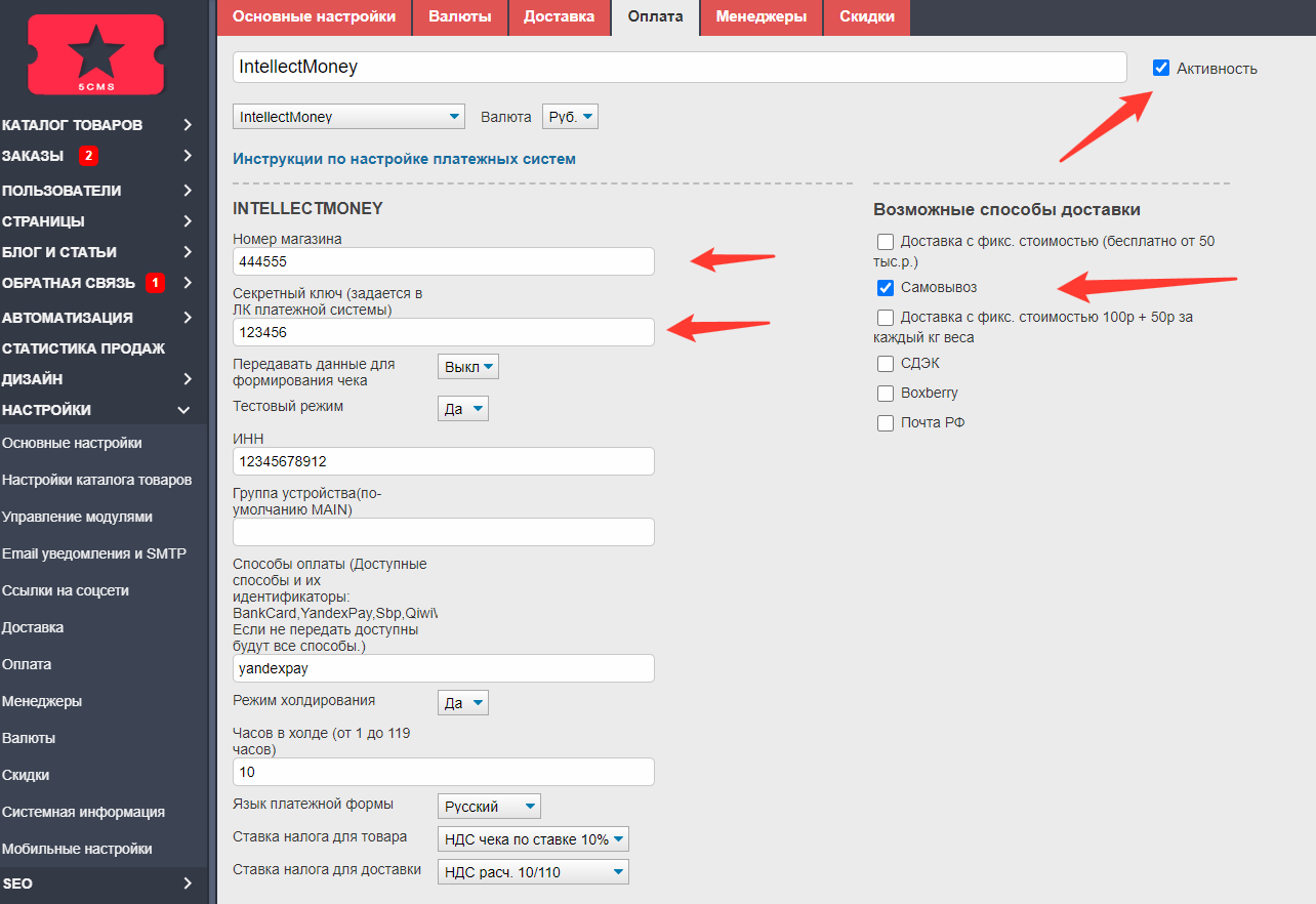Нажимаем кнопку добавить и в открывшемся окне выбираем способ оплаты IntellectMoney и заполняем поля с настройками модуля;