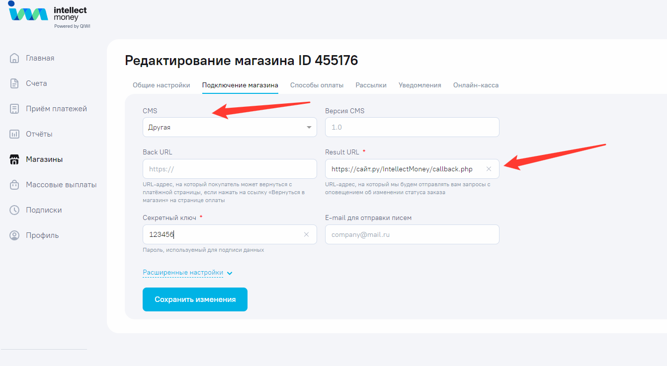 ResultUrl: https://сайт.ру/IntellectMoney/callback.php или https://сайт.ру/payment/IntellectMoney/callback.php (в зависимости от версии CMS)