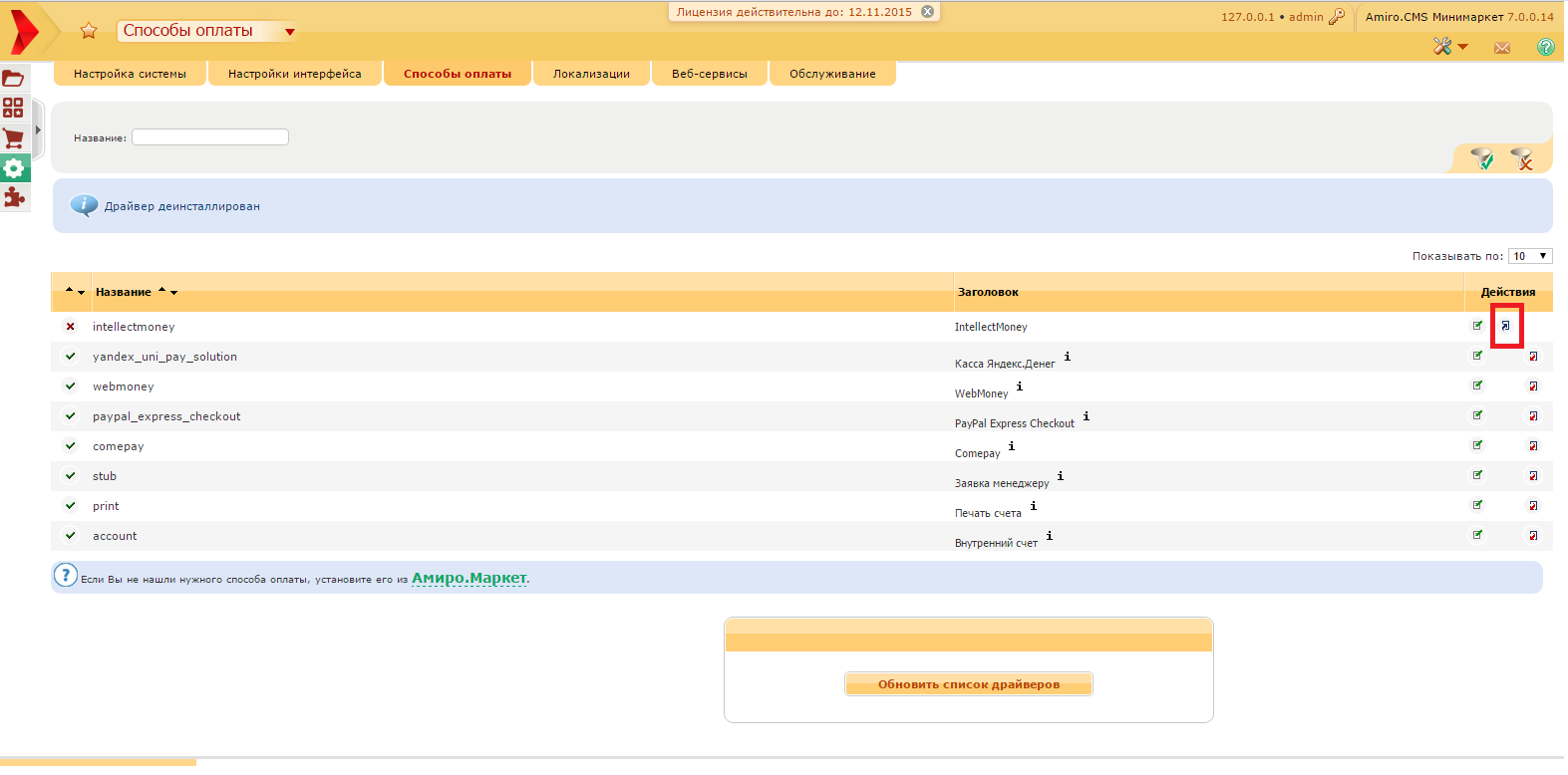 - В админке перейти Сервис-Настройки системы-Платежные системы, нажать кнопку "установить" в строке с intellectmoney.