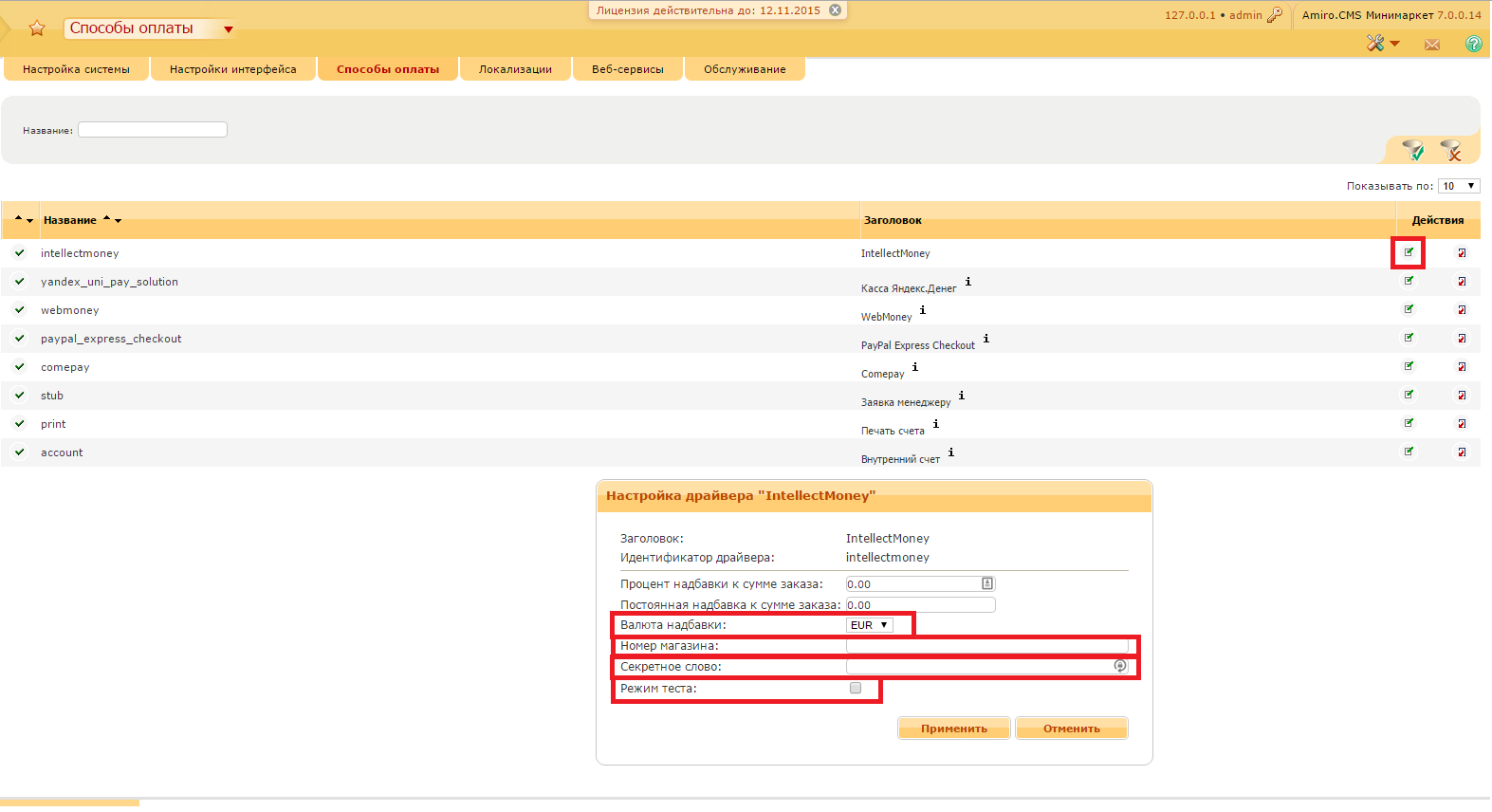 - В строке с intellectmoney нажать кнопку "редактировать", заполнить поле "Номер магазина" и "Секретное слово", если необходимо, можно включить "Режим теста", счета будут выставляться в тестовой валюте.