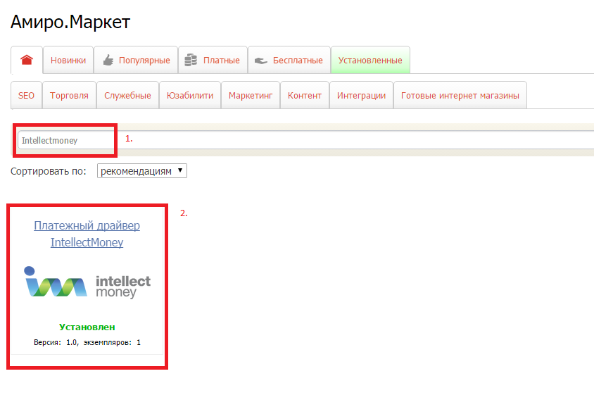 В строке поиска напишите IntellectMoney и нажмите <Enter> В найденном плагине нажмите установить: