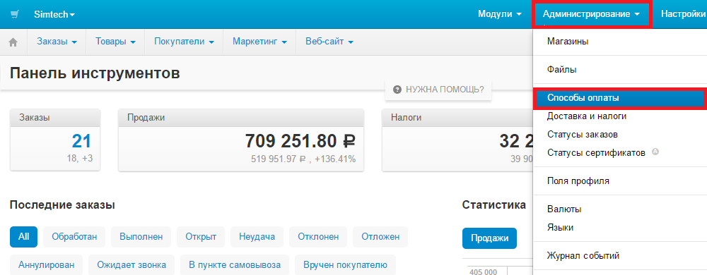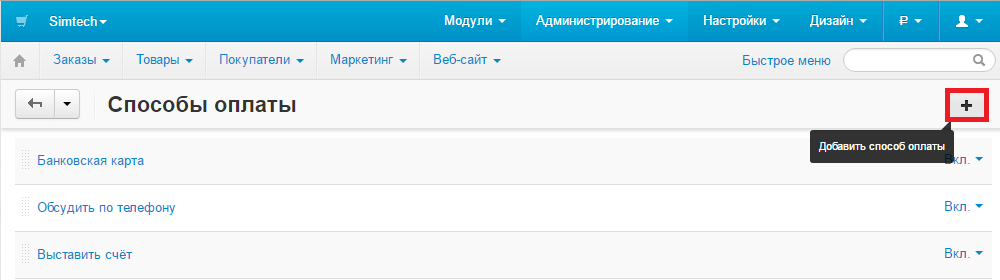 В админке перейти Администирование-Способы оплаты