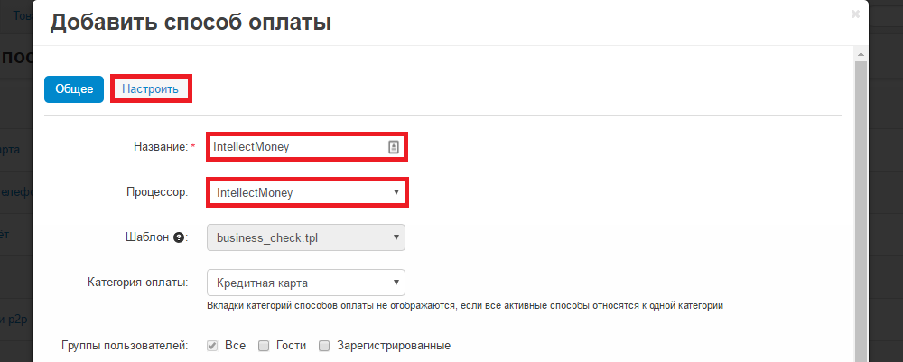 Название IntellectMoney, процессор-IntellectMoney, далее вкладка Настроить.