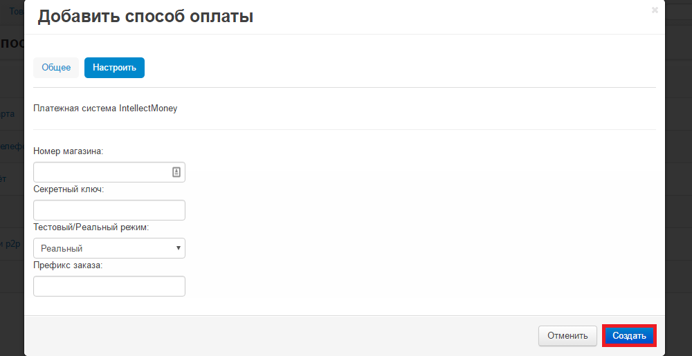 Заполнить все поля (Префикс заказа можно указать - Оплата заказа №). Режим теста означает выставление счета TST (должна быть установлена базовая валюта с кодом TST). После настройки нажать Создать.