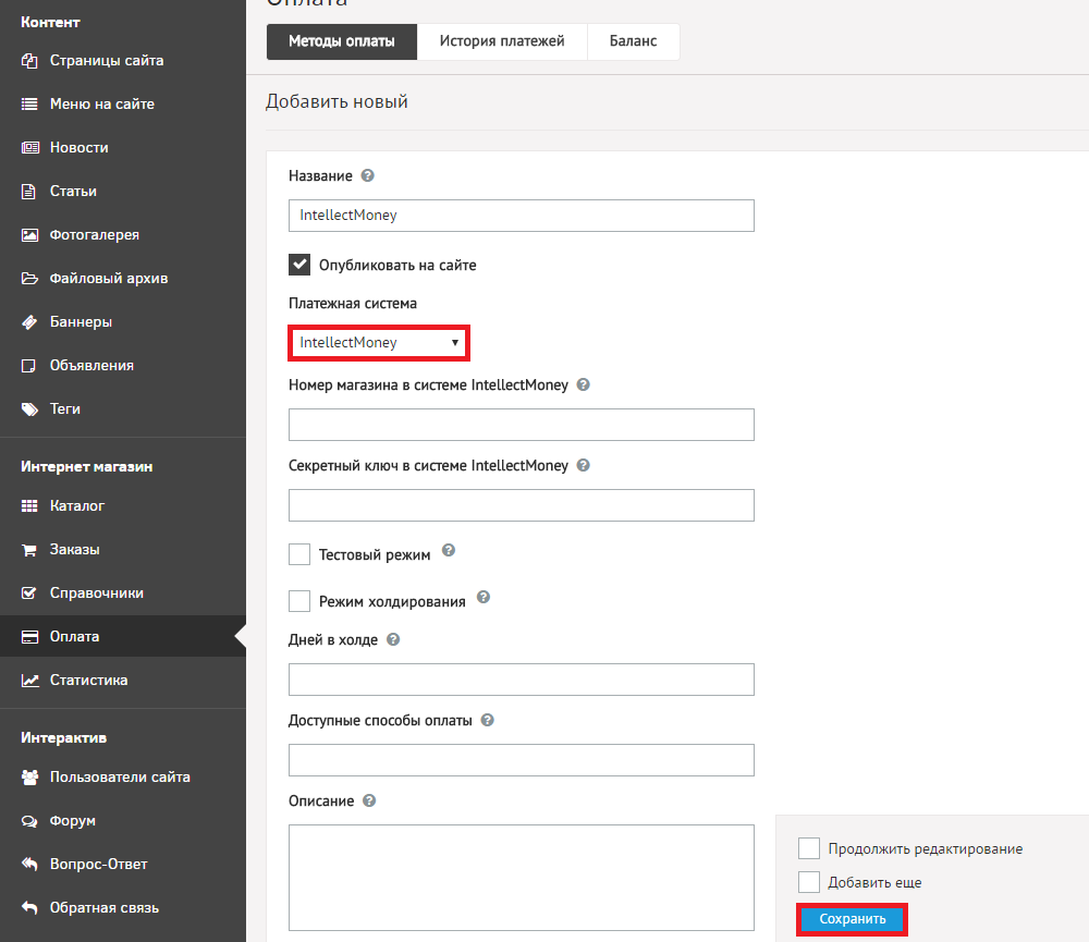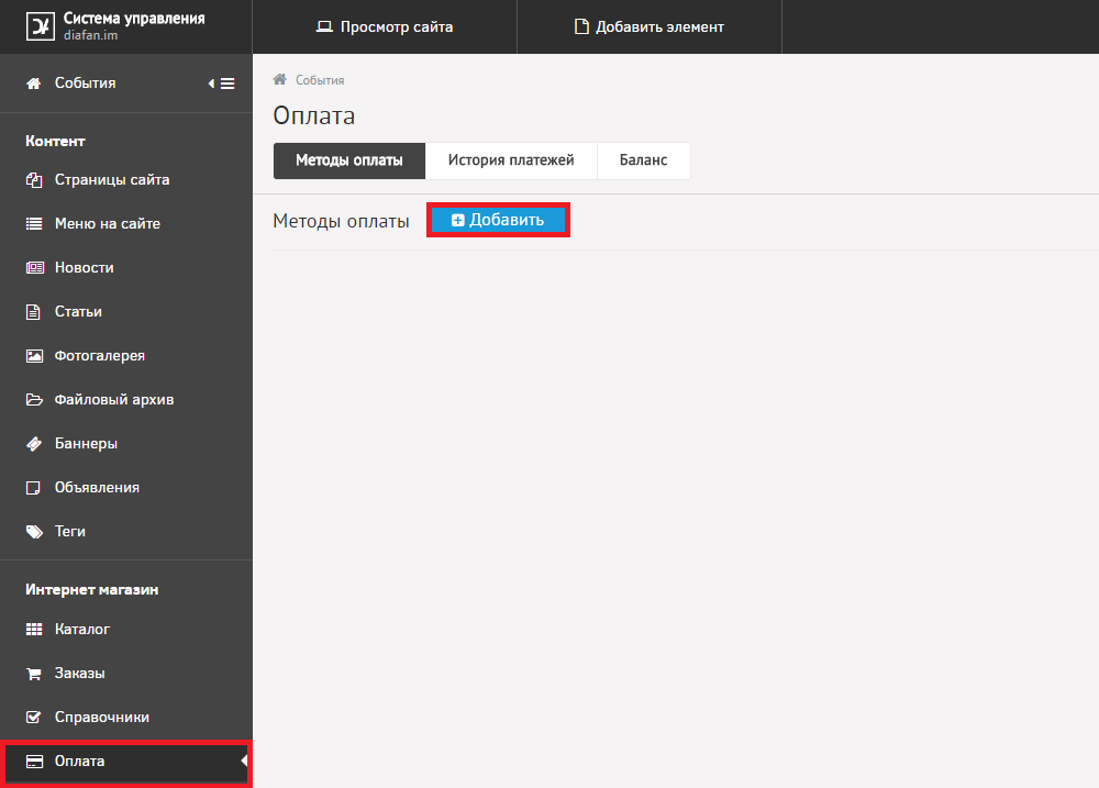 В админ. панели перейти в раздел «Оплата» нажать кнопку «Добавить»