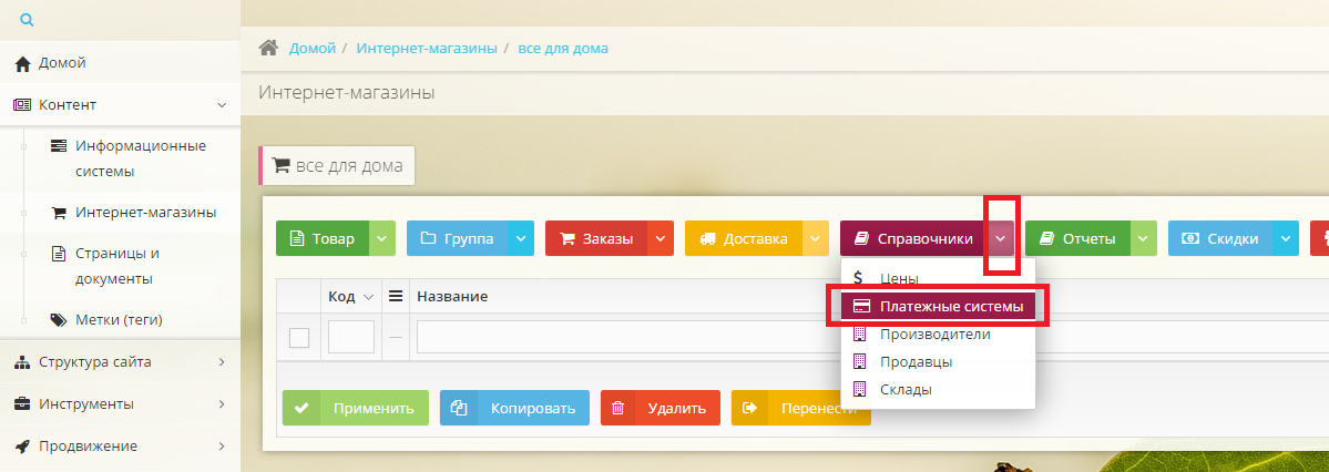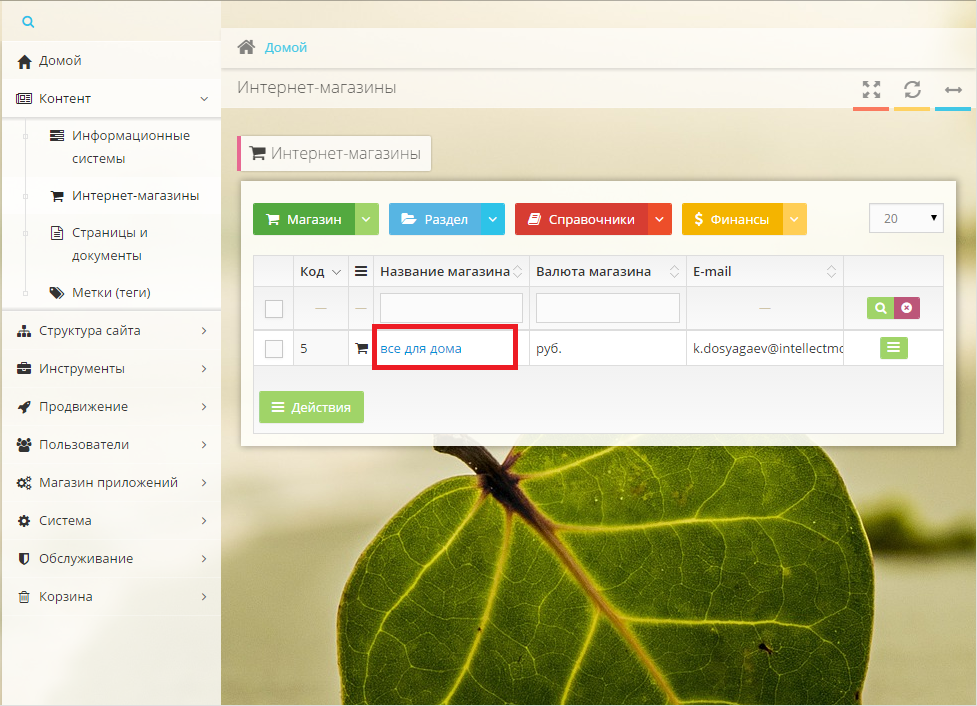 Из главного меню выбираем "Контент" - "Интернет-магазины" и в открывшемся списке выбираем интересующий нас магазин.