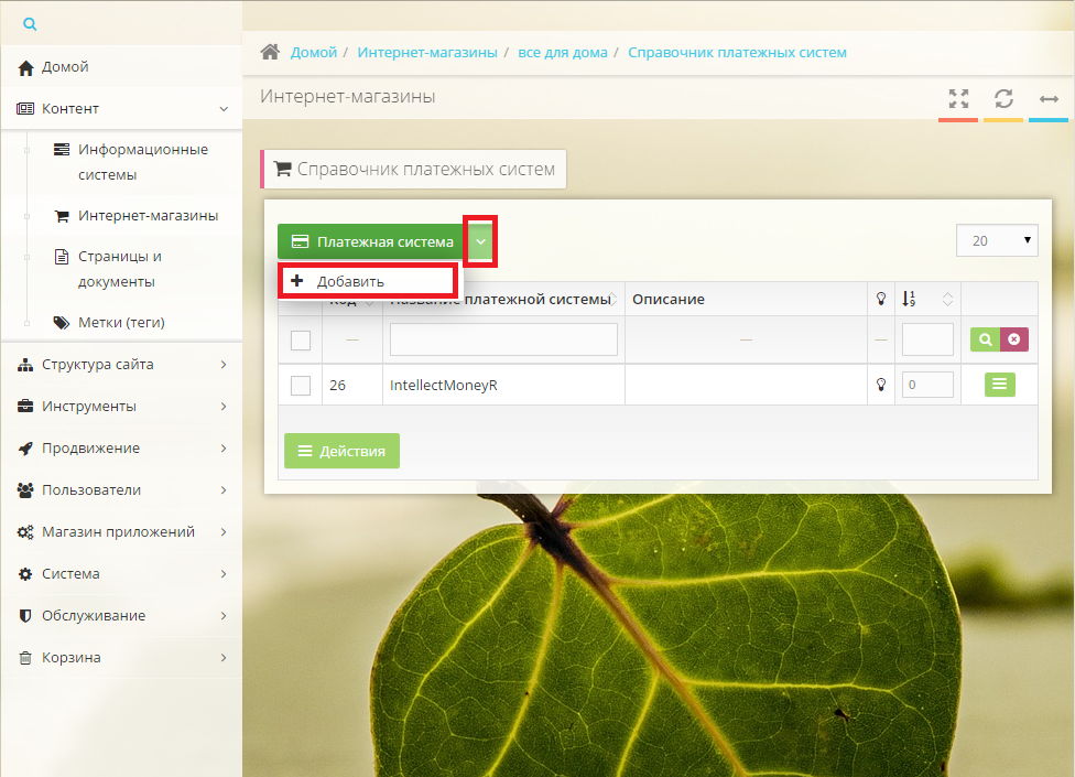 В открывшемся диалоге "Платежные системы" Нажимаем "Добавить"