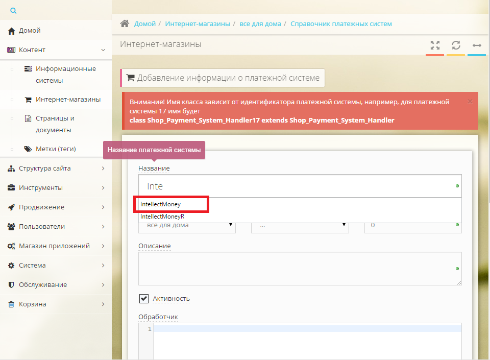 В открывшемся окне начинаем вводить "Inte.." и в выпадающем списке находим IntellectMoney.