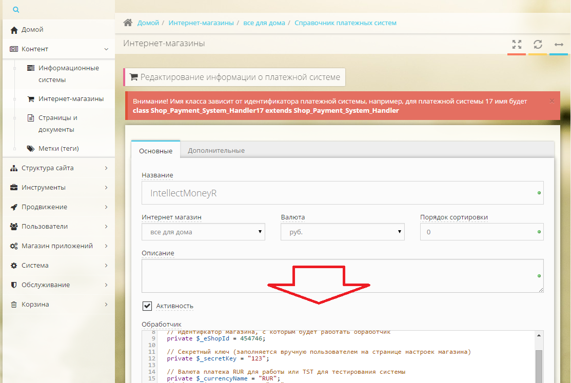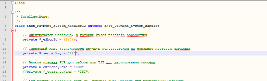 здесь $_eShopId = Номер Вашего магазина в системе IntellectMoney, $_secretKey = Секретный ключ, введенный Вами в настройках личного кабинета, $_currencyName = валюта. Для реальных платежей оставьте RUR, для совершения тестового платежа введите TST. Вставьте скопированный код в свойства созданной платежной системы.
