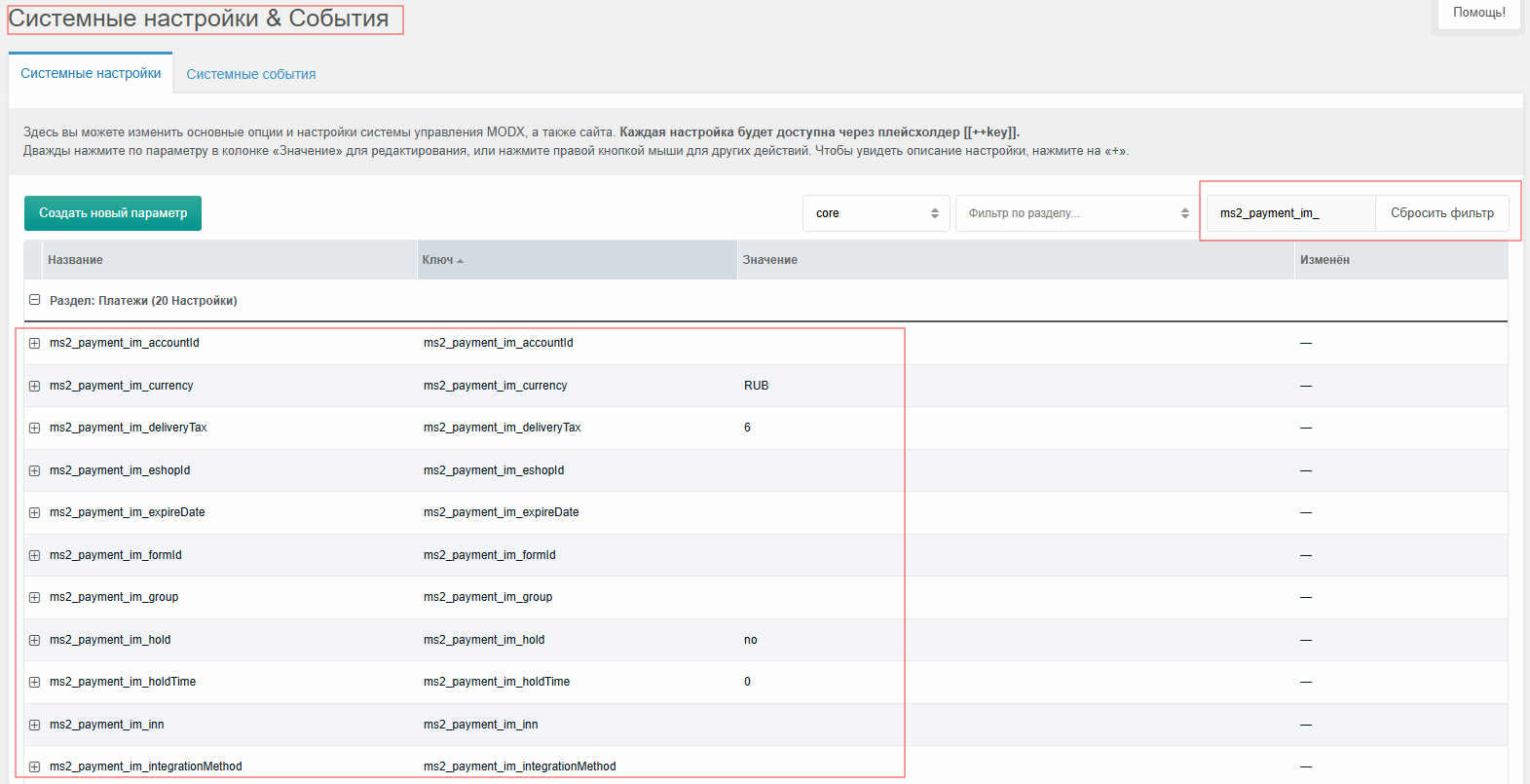 Включаем отображени параметров платежного модуля, для чего в поле "Поиск по ключу" вставляем значение "ms2_payment_im_";