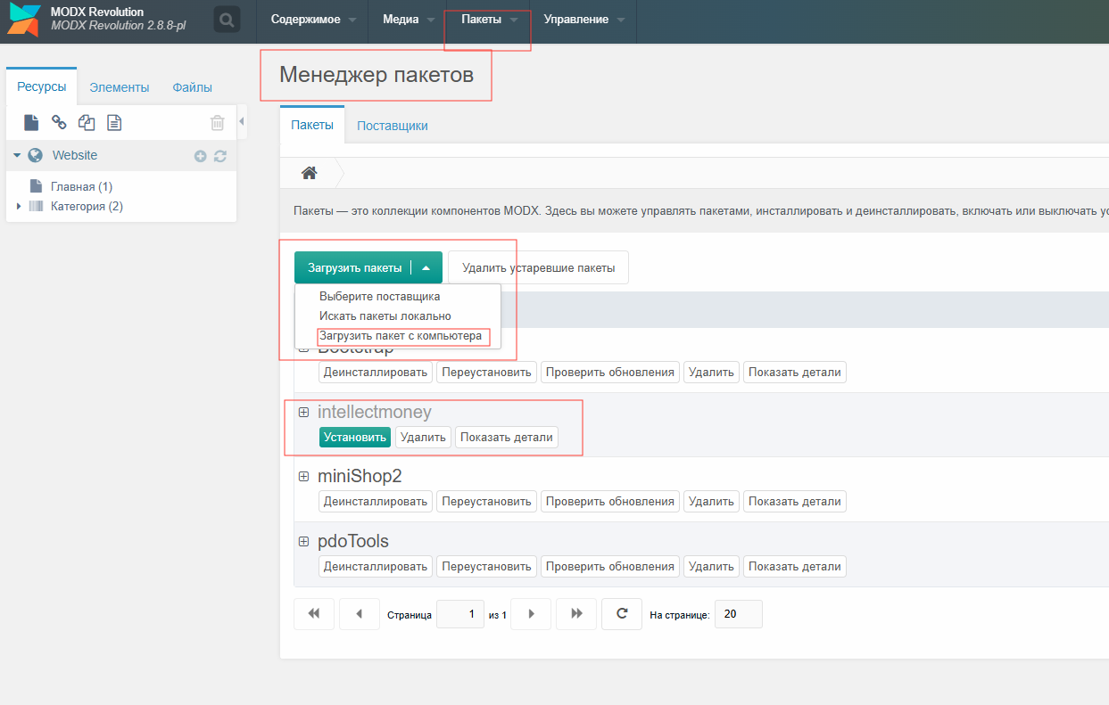 - В списке пакетов после загрузки появиться пакет: "intellectmoney", который необходимо установить.