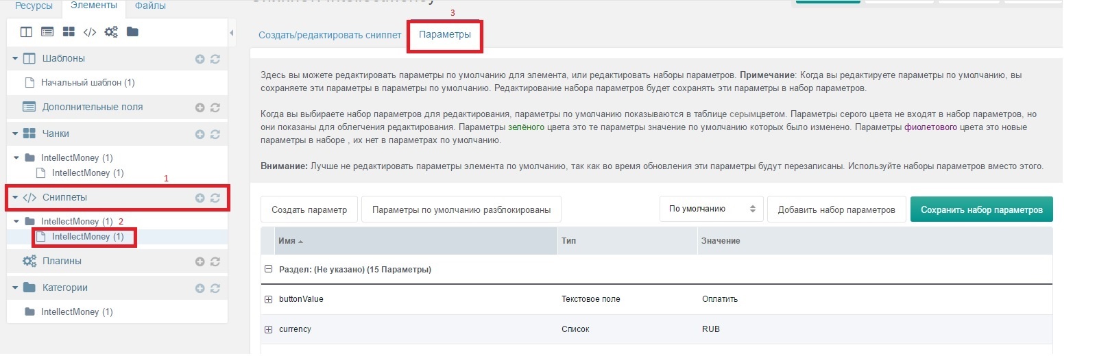 - В поле Код шаблона/Содержание ресурса(в зависимости от места вызова),в месте где должна появиться кнопка прописываем [[!IntellectMoney].