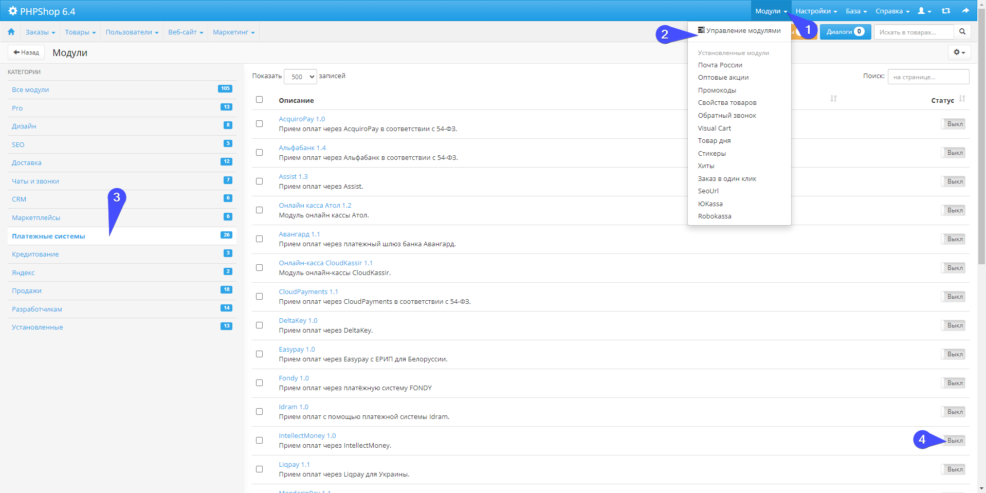 После размещения файлов в директории с модулями PHPShop (\phpshop\modules), необходимо включить модуль оплаты IntellectMoney, следуя приведенным ниже шагам: