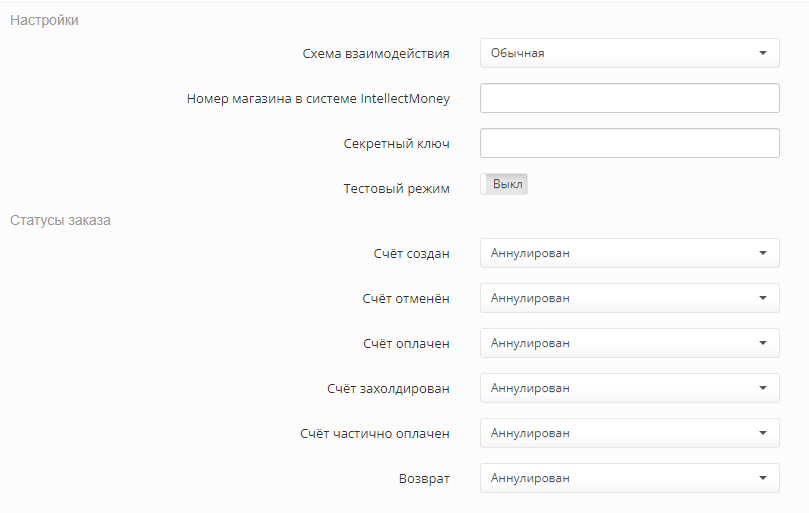 Раздел Статусы заказа позволяет указать какой статус необходимо установить, когда в системе IntellectMoney происходит то или иное событие со счетом (СКО).