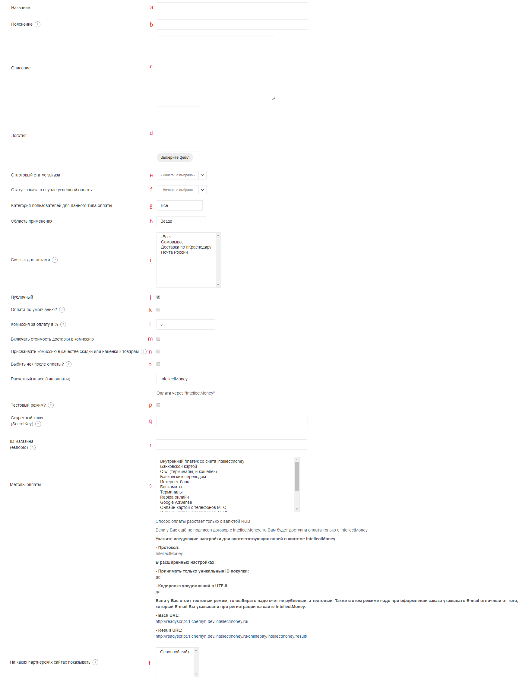 - Описание - описание способа оплаты для покупателей, пример: Оплата платежным агрегатором IntellectMoney. Более 20-ти способов, включая банковскую карту.