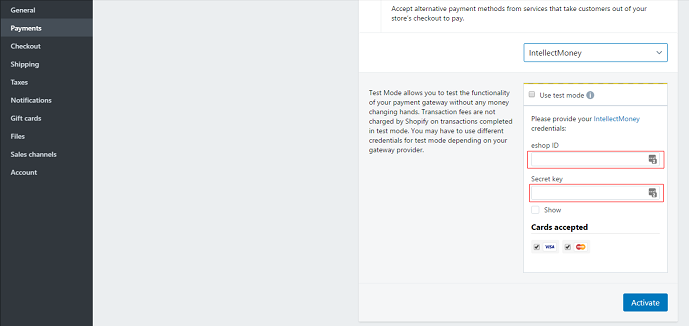 - 'Use test mode' - Переводит магазин в тестовый режим. Система IntellectMoney принимает пришедшую валюту, как тестовую;