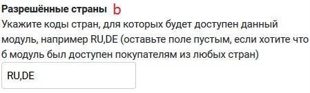 b. Разрешённые страны - коды стран, для которых доступна оплата модулем