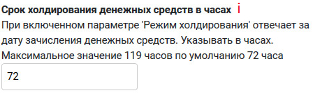i. Срок холдирования денежных средств в часах - при включенном параметре 'Режим холдирования' отвечает за дату зачисления денежных средств. Указывать в часах. Максимальное значение 119 часов по умолчанию 72 часа