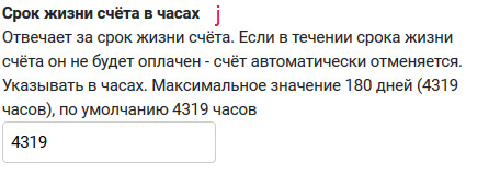 j. Срок жизни счёта в часах - отвечает за срок жизни счёта. Если в течении срока жизни счёта он не будет оплачен - счёт автоматически отменяется. Указывать в часах. Максимальное значение 180 дней (4319 часов), по умолчанию 4319 часов. При включенном параметре 'Режим холдирования' максимальное значение 119 часов по умолчанию 72 часа