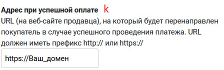 k. Адрес при успешной оплате - URL (на веб-сайте продавца), на который будет перенаправлен покупатель в случае успешного проведения платежа. URL должен иметь префикс http:// или https://