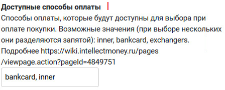 l. Доступные способы оплаты - способы оплаты, которые будут доступны для выбора при оплате покупки. Возможные значения (при выборе нескольких они разделяются запятой): inner, bankcard, exchangers.