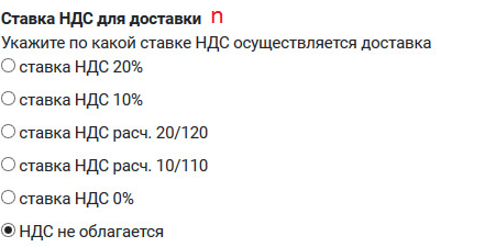 n. Ставка НДС для доставки - укажите по какой ставке НДС осуществляется доставка (Обязательно при использовании онлайн-кассы)