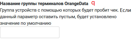 q. Название группы терминалов OrangeData - группа устройств с помощью которых будет пробит чек. Если данный параметр оставить пустым, будет установлено значение по умолчанию