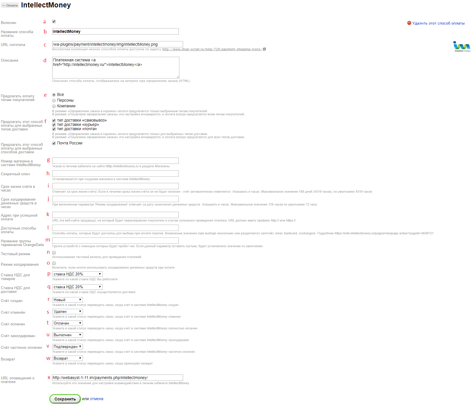 - * Счёт оплачен - укажите в какой статус переводить заказ, когда счёт в системе IntellectMoney полностью оплачен